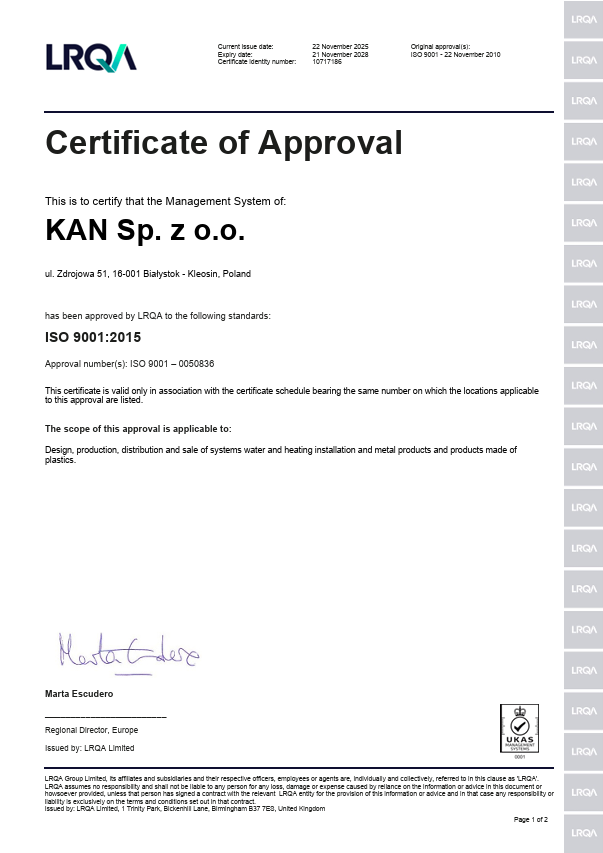 KAN , aspiring to ensure full customer satisfaction and caring for the development and modernisation of the System KAN-therm, maintains the highest quality of the supplied product and a high standard of service. The confirmation of this is the documented, implemented and fully executed Quality Management System based on the ISO 9001:2015 standard, whose effectiveness is subject to continuous improvement. The system is certified by the renowned certification body Lloyd's Register Quality Assurance Limited.